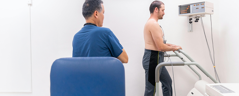 Cardiac respiratory stress test (advanced), muscle strength and joint mobility evaluations.